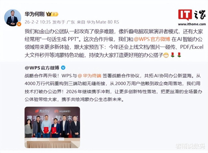近日,WPS与华为终端正式签署战略合作协议,宣布双方将围绕AI驱动的协同办公场景深化合作,共同开拓全场景智能办公新领域。华为终端BG首席执行官何刚也通过微博回应,确认双方将联合攻克技术难题,并预告了“文档/图片一碰传”、“PDF/Excel大文件秒开”等即将上线的鸿蒙特色功能。